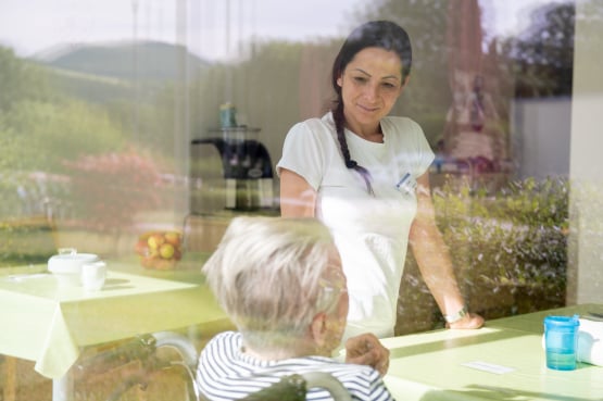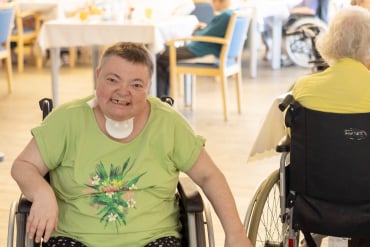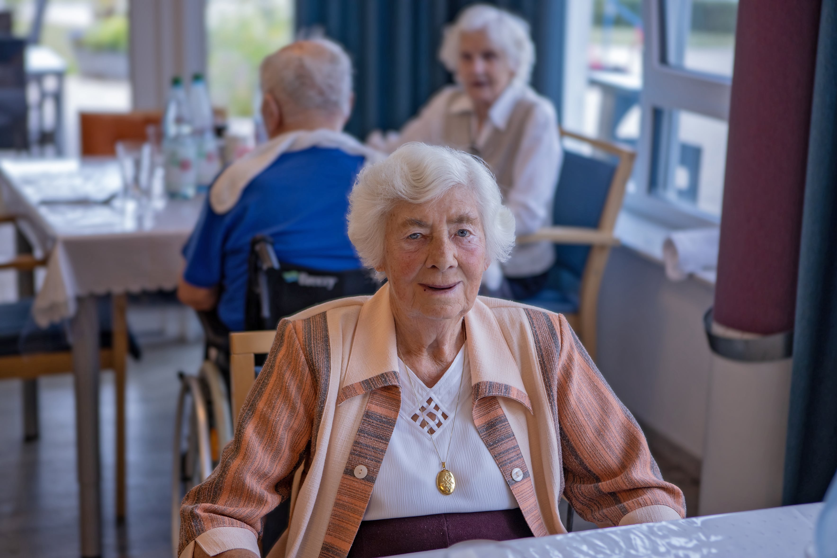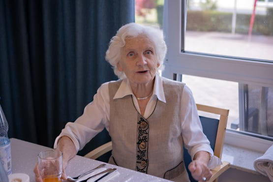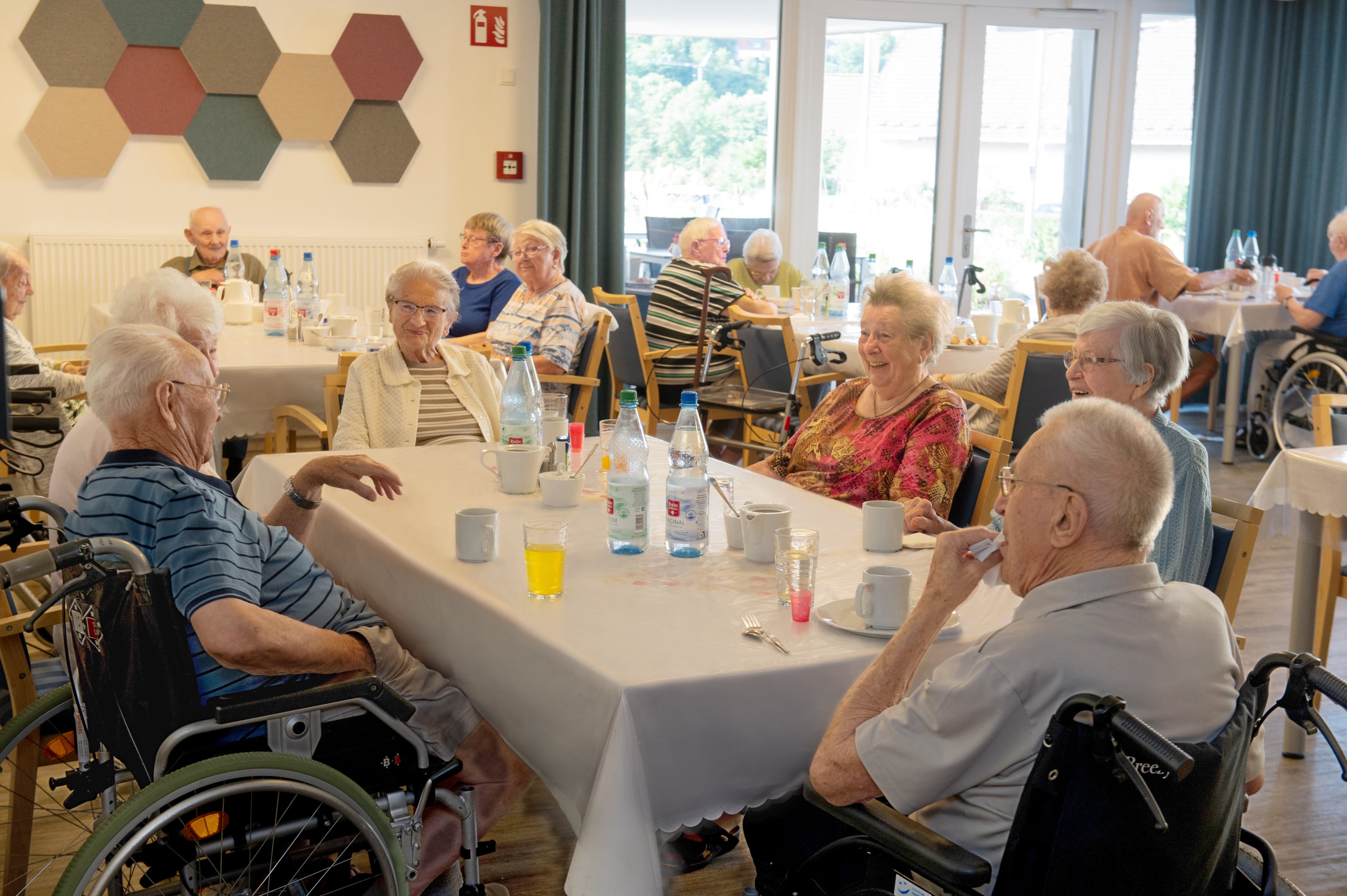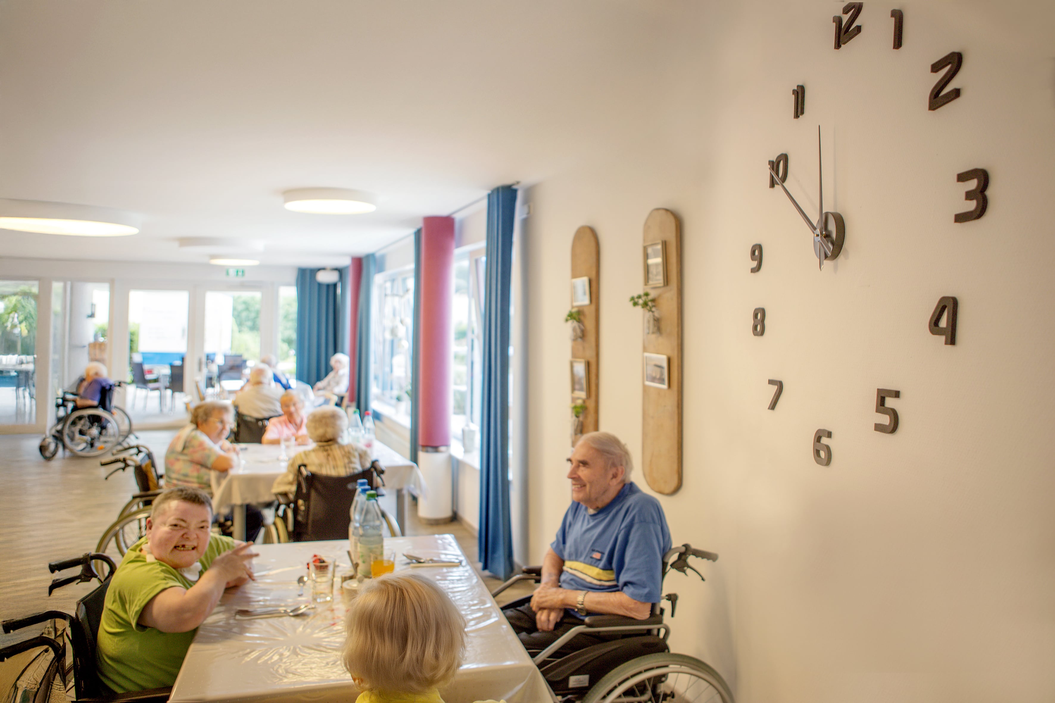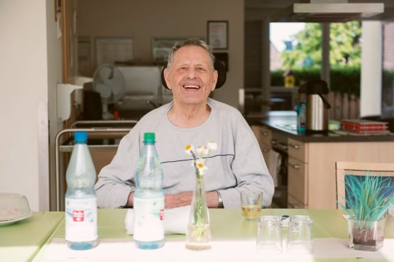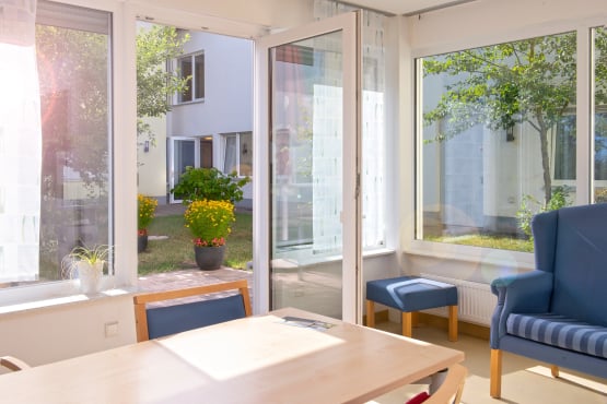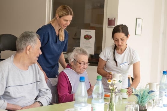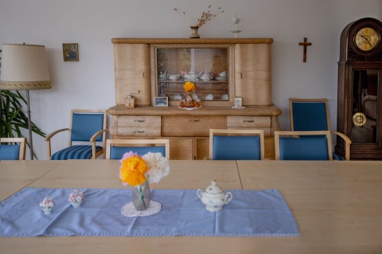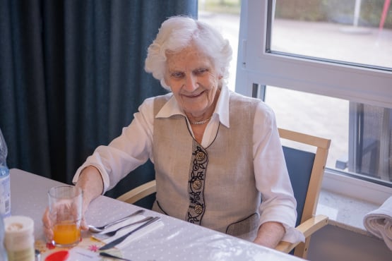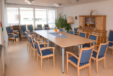 In der hellen und einladenden Cafeteria im Erdgeschoss trifft man sich mit anderen Hausbewohner*innen und nimmt die Mahlzeiten ein. Auch Angehörige und Freunde sind jederzeit willkommen.