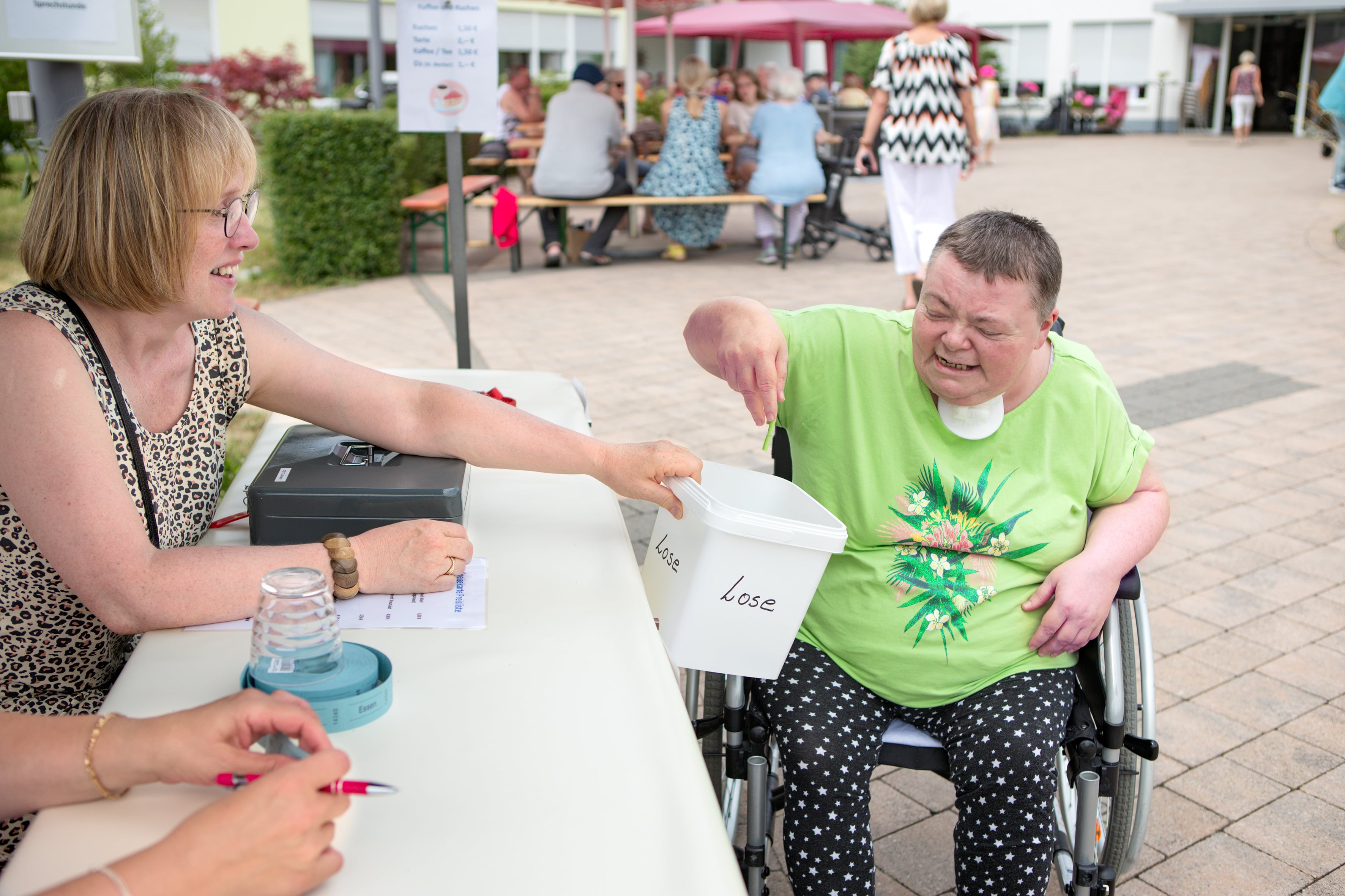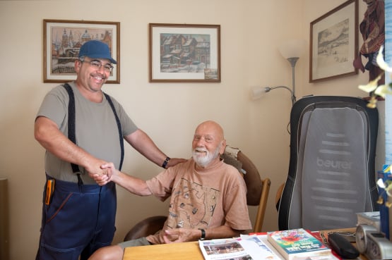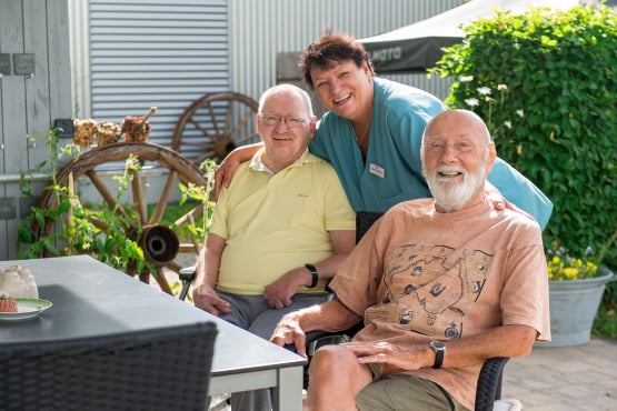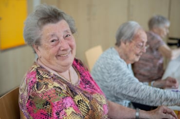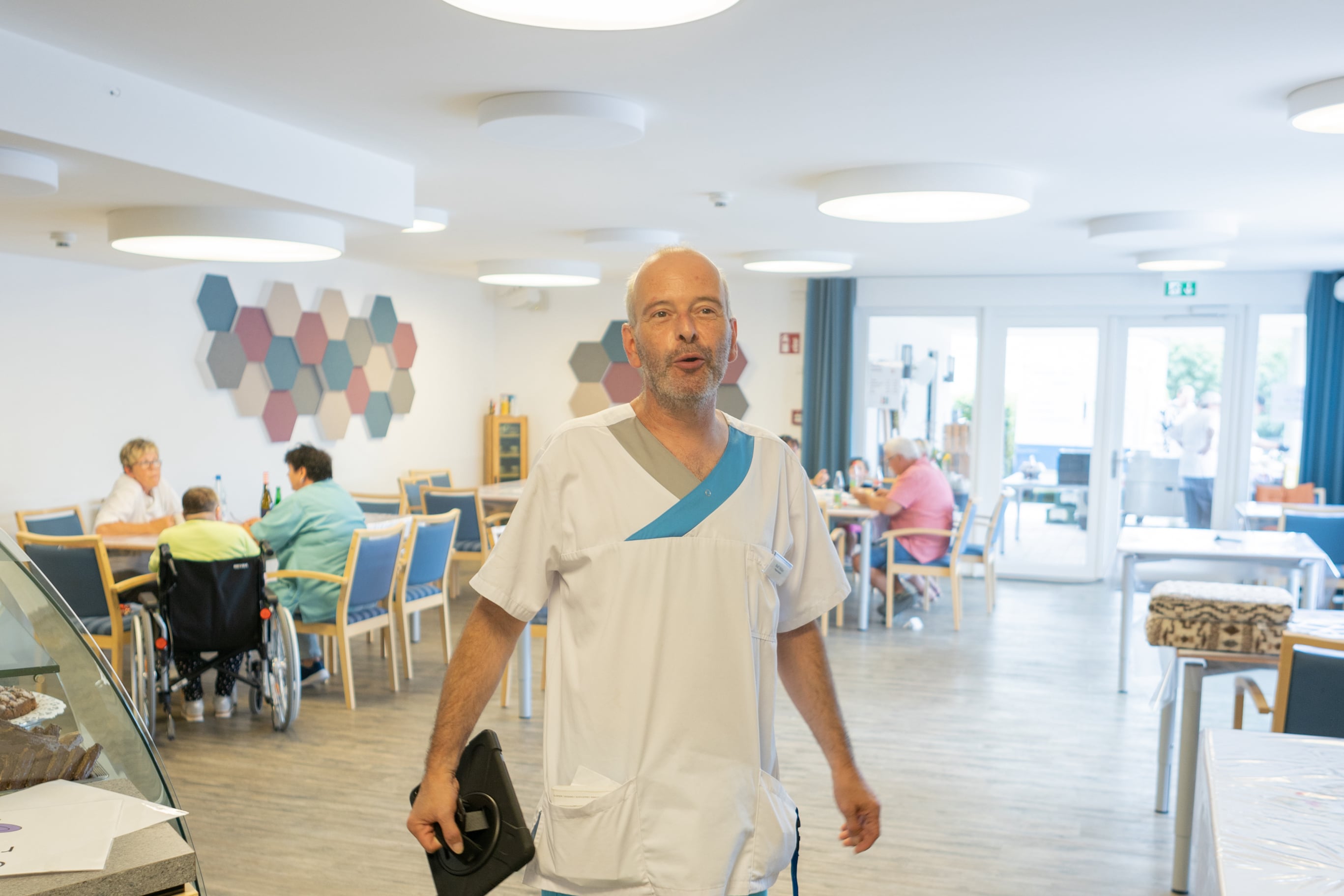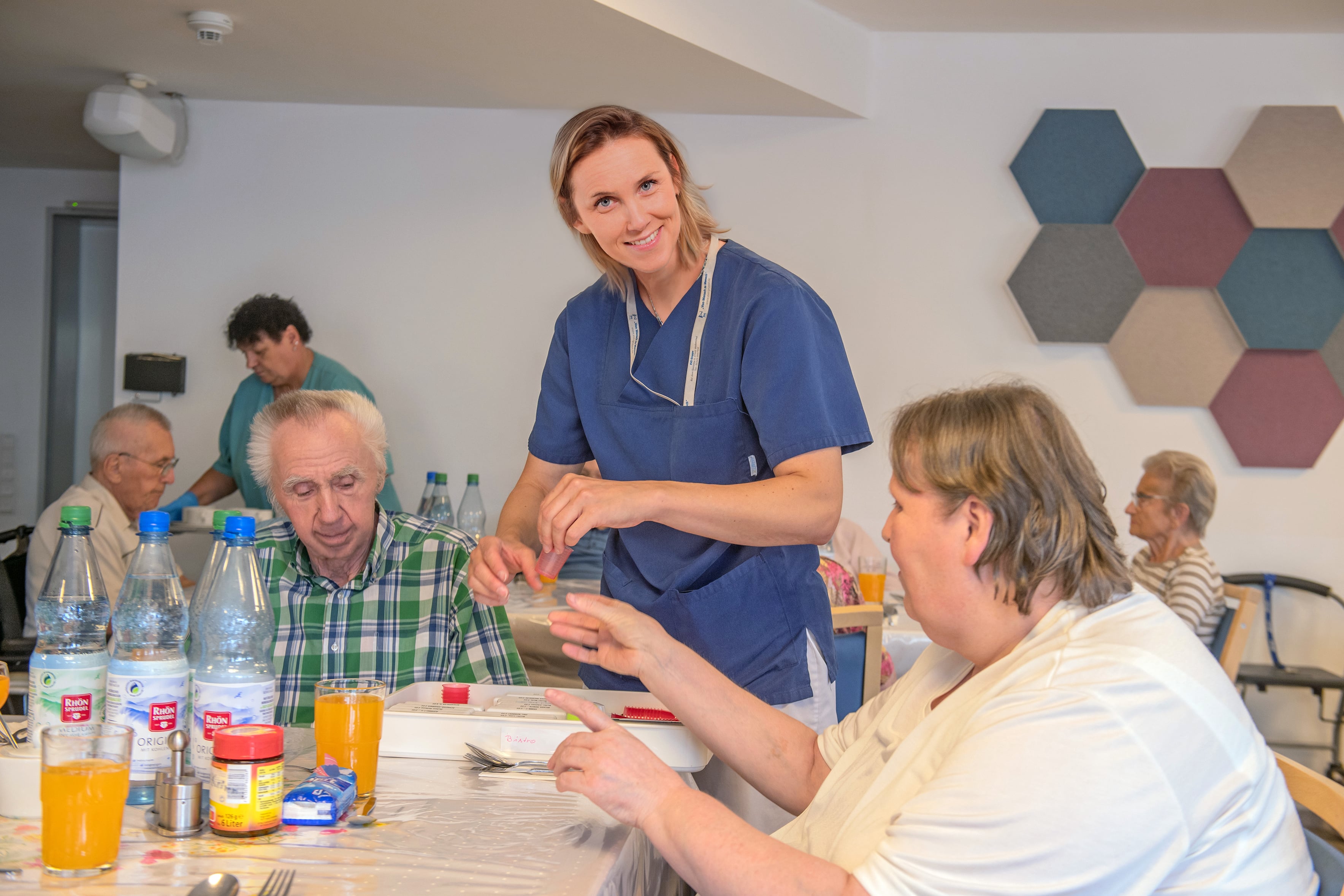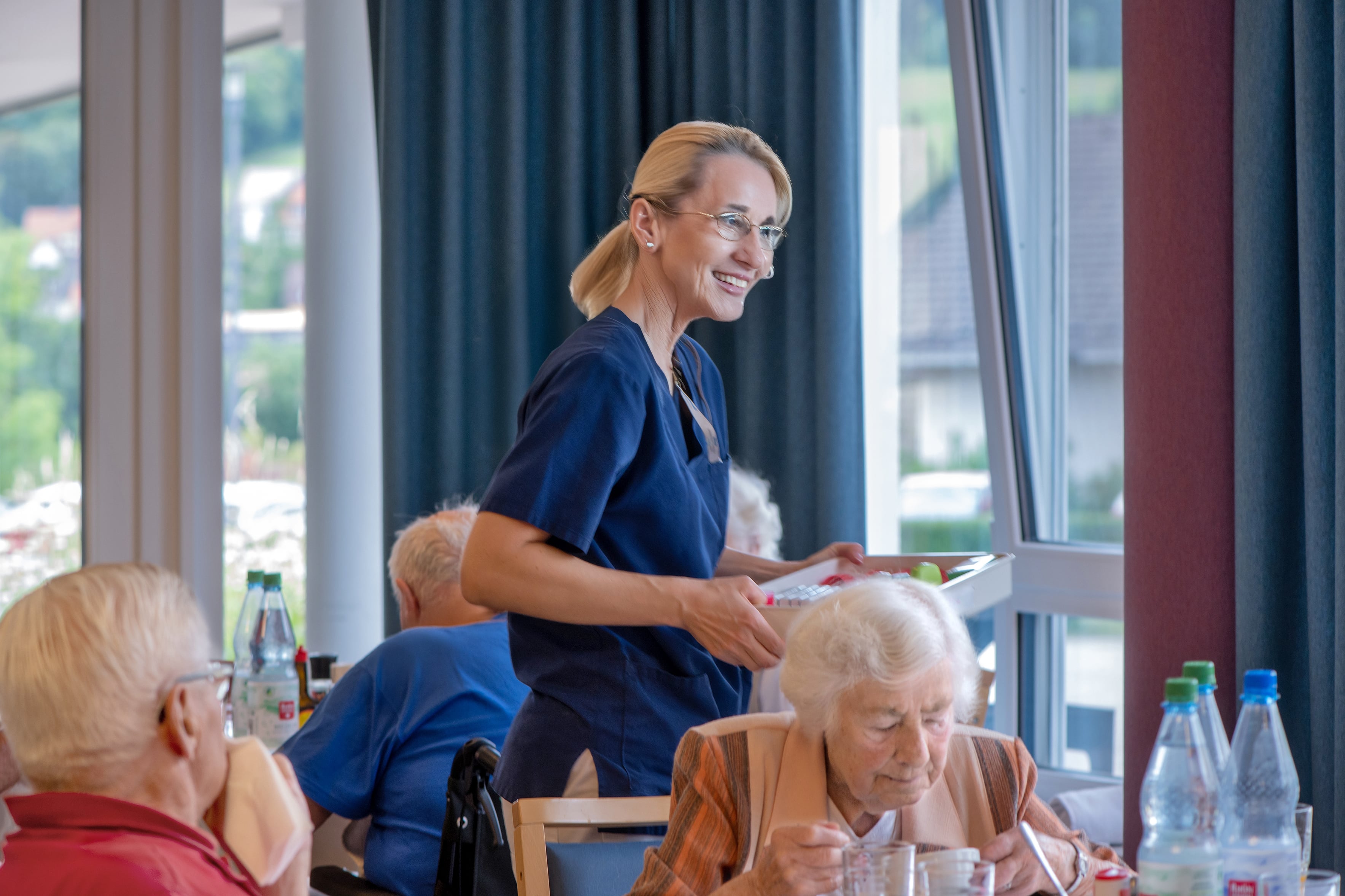 In der hellen und einladenden Cafeteria im Erdgeschoss trifft man sich mit anderen Hausbewohner*innen und nimmt die Mahlzeiten ein. Auch Angehörige und Freunde sind jederzeit willkommen.